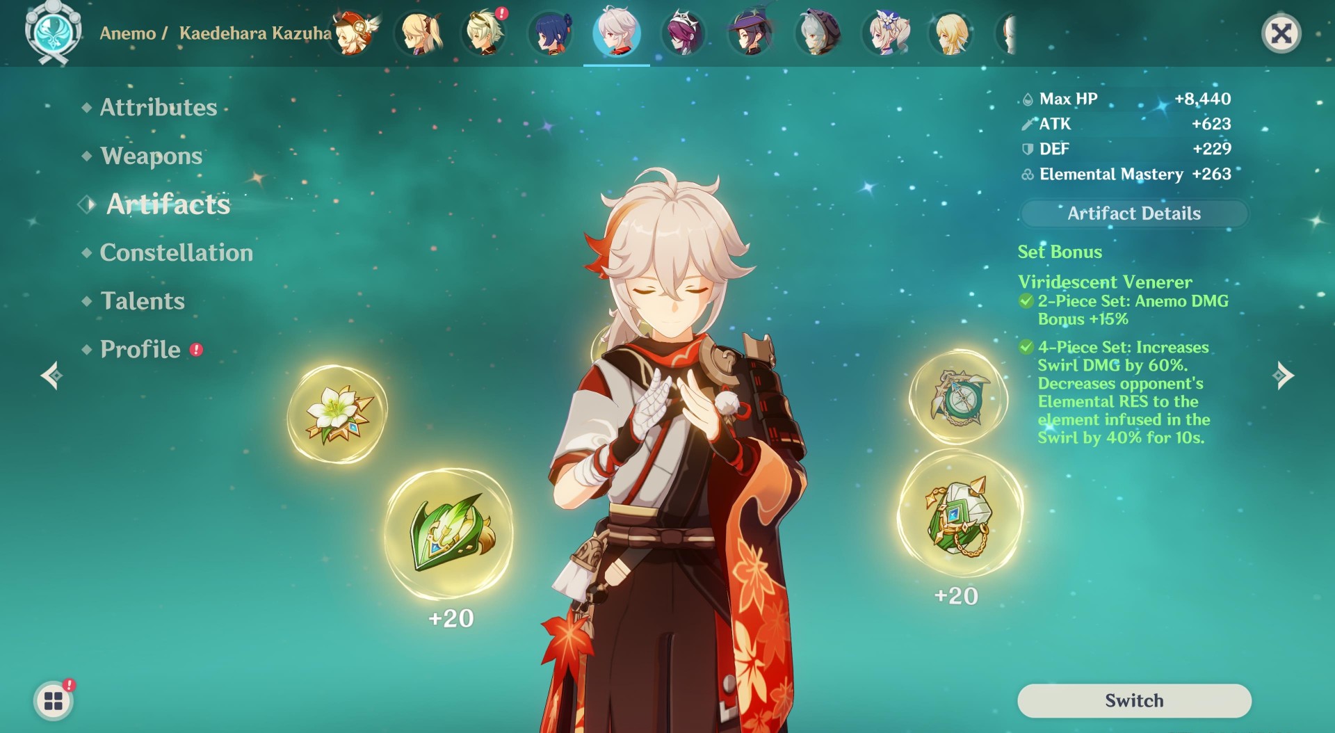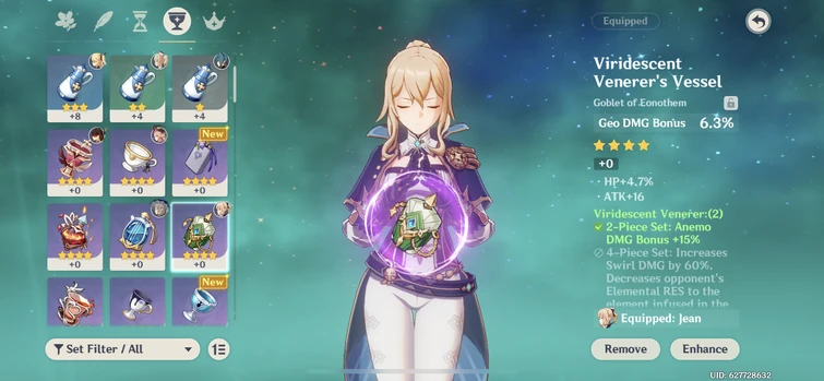 Artifacts can be obtained through Wishes purchased from Merchants can be looted from chests enemies and are obtained as rewards for completing Quests. Viridescent Venerer 2-Piece Bonus - Anemo DMG Bonus 15 4-Piece Bonus - Increases Swirl DMG by 60. The Viridescent Venerer set will give a damage bonus to Anemo at two pieces and a massive bonus to Swirl damage at four pieces.